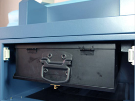 16、先取走收片盒,再打开照排机电源并脱机,液晶上显示:“ERR:缺胶片”。用右手拇指向右推位于供片盒托板下的插销,然后托起供片盒托板,并控制其慢慢升起,但不要一次升到顶。